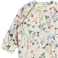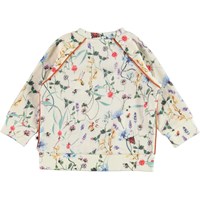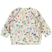 Dicte ist ein Baby-Sweatshirt mit einem Aufdruck von wilden Blumen. Der Pullover hat Raglanärmel mit roten Paspeln in den Armlöchern sowie einen Knopfverschluss auf einer Seite.