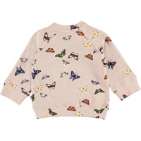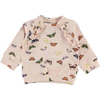 Dima ist ein rosa Baby-Sweatshirt mit bunten Schmetterlingen und Rüschendetails. Dima hat Raglanärmel und einen Druckknopf am Hals, der das An- und Ausziehen des Pullovers erleichtert. Kombinieren Sie mit passenden Hosen.