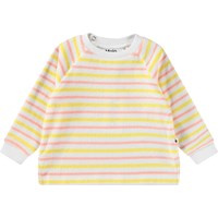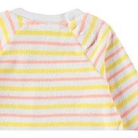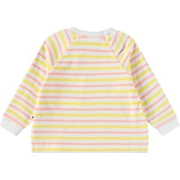 Langärmeliges Oberteil aus weichem Baumwoll-Frottee für die Kleinen. Das Oberteil hat gerippte Abschlüsse am Ausschnitt und an den Ärmeln sowie einen Knopfverschluss auf der Rückseite der Schulter, was das An- und Ausziehen erleichtert. Das Oberteil ist gestreift in Weiß, Gelb und Pink.
