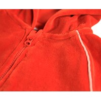 Roter Kapuzenpulli für die Kleinen aus weichem Velours mit weißen Paspeln entlang der Raglanärmel. Die Kapuze hat kleine Ohren. Kombiniere den Kapuzenpulli mit der passenden Hose.
