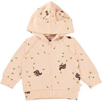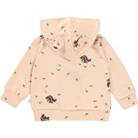 Dorothy ist ein rosa Baby-Hoodie mit Eichhörnchen- und Nuss-Prints. Der Hoodie hat aufgenähte kleine Öhrchen an der Kapuze. Dorothy hat einen Reißverschluss und schöne rote Paspeln. Kombiniere den Hoodie mit der passenden Hose.