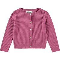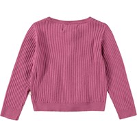 Lila Strickcardigan aus Öko-Baumwolle für die Kleinsten. Der Cardigan hat ein feines Rippmuster und gerippte Abschlüsse an den Ärmeln, am Ausschnitt und an der Taille. Er wird vorne mit kleinen Perlmuttknöpfen geschlossen.