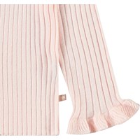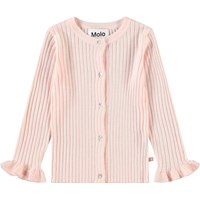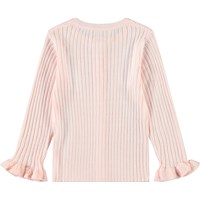 Rosa Strickjacke für die Kleinen. Die Strickjacke ist in einem Rippenstrick mit gerippten Kanten am Hals und gerüschten Kanten an den Ärmeln. Sie wird vorne mit kleinen Perlmuttknöpfen geschlossen.