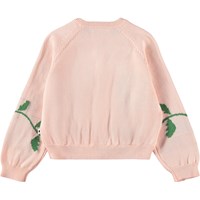 Rosa gestrickte Strickjacke für die Kleinen aus weicher, biologischer Baumwolle. Sie hat ein dekoratives Blumenmotiv und Knöpfe an der Vorderseite.