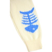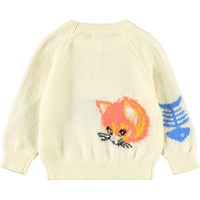 Gestrickter Pullover für die Kleinen. Der Pullover ist hellgelb, mit Raglanärmeln und farbigen Motiven von Tieren und Gemüse. Der Pullover hat gerippte Kanten am Hals, an den Ärmeln und am Saum. Kombinieren Sie ihn mit der passenden Hose für ein komplettes Set.