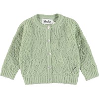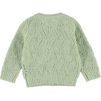 Gilli ist eine hellgrüne Babystrickjacke. Die Strickjacke hat ein schönes Lochmuster und einen Knopfverschluss auf der Vorderseite.