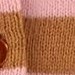 Ginny ist eine langärmelige Strickjacke mit braunen und rosa Streifen. Ginny hat vorne Knöpfe sowie Ripp am Hals, an den Ärmelenden und unten.