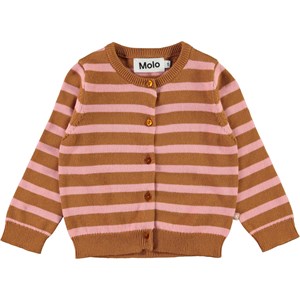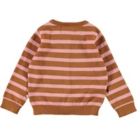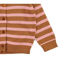 Ginny ist eine langärmelige Strickjacke mit braunen und rosa Streifen. Ginny hat vorne Knöpfe sowie Ripp am Hals, an den Ärmelenden und unten.