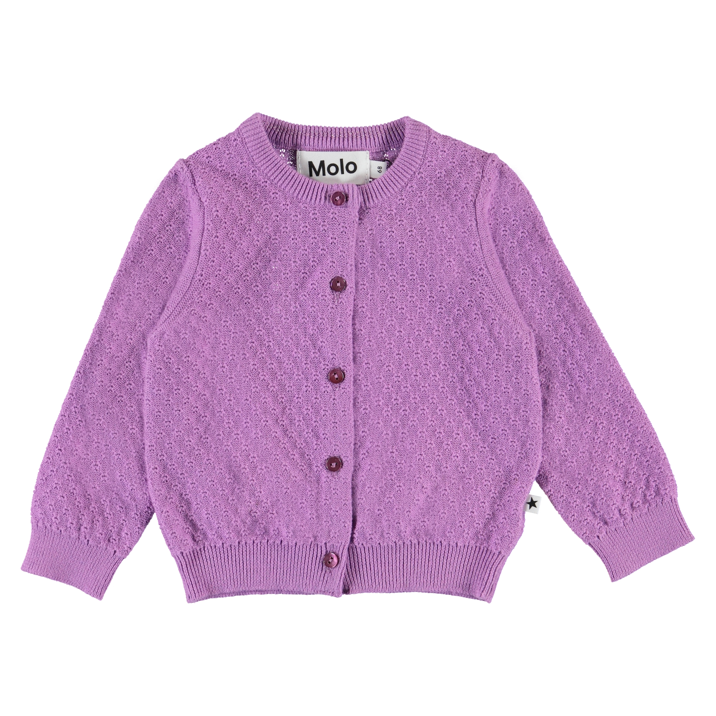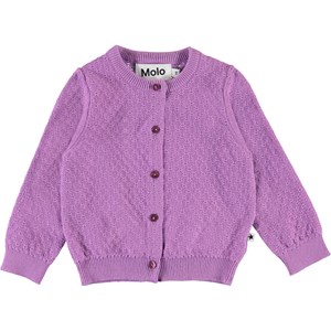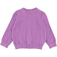 Ginny ist eine langärmelige, gestrickte lila Baby-Strickjacke mit einem feinen Lochmuster. Ginny hat vorne perlmuttweiße Knöpfe sowie Ripp unten, am Hals und an Ärmelende.