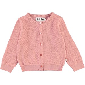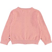 Ginny ist eine langärmelige, korallenfarbene Baby-Strickjacke mit schönem Lochmuster. Ginny hat vorne passende Perlmuttknöpfe sowie Rippbündchen an Hals, Ärmelabschlüssen und Saum.