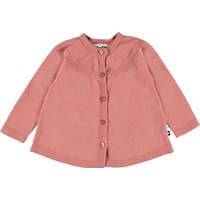 Gisela ist eine Baby-Baumwolle-Cardigan in Dunkelrosa mit A-Form. Die Strickjacke hat schöne Nähte am Kragen und einen Knopfverschluss vorne.