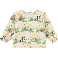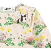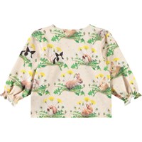 Langärmeliges Oberteil für die Kleinen aus Öko-Baumwolljersey. Das Oberteil hat eine lockere Passform und Ärmel mit elastischen Bündchen an den Handgelenken, die einen kleinen Rüschensaum bilden. Es gibt einen Knopfverschluss an der Schulter, der das An- und Ausziehen erleichtert. Das Oberteil ist rosa mit einem Druck von Hasen und Löwenzahn.