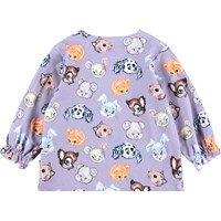 Hellvioletter Langarm-Top für die Kleinen aus Öko-Baumwolljersey mit einem Druck von niedlich gezeichneten Tieren. Das Langarm-Top hat eine lockere Passform und Ärmel mit elastischen Bündchen an den Handgelenken, was einen kleinen Rüschenrand ergibt. Es gibt einen Knopfverschluss an der Schulter, der das An- und Ausziehen erleichtert.