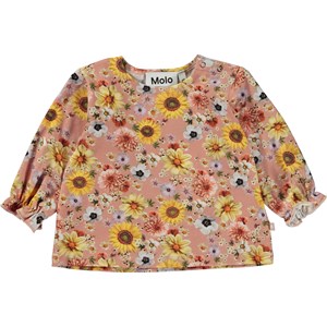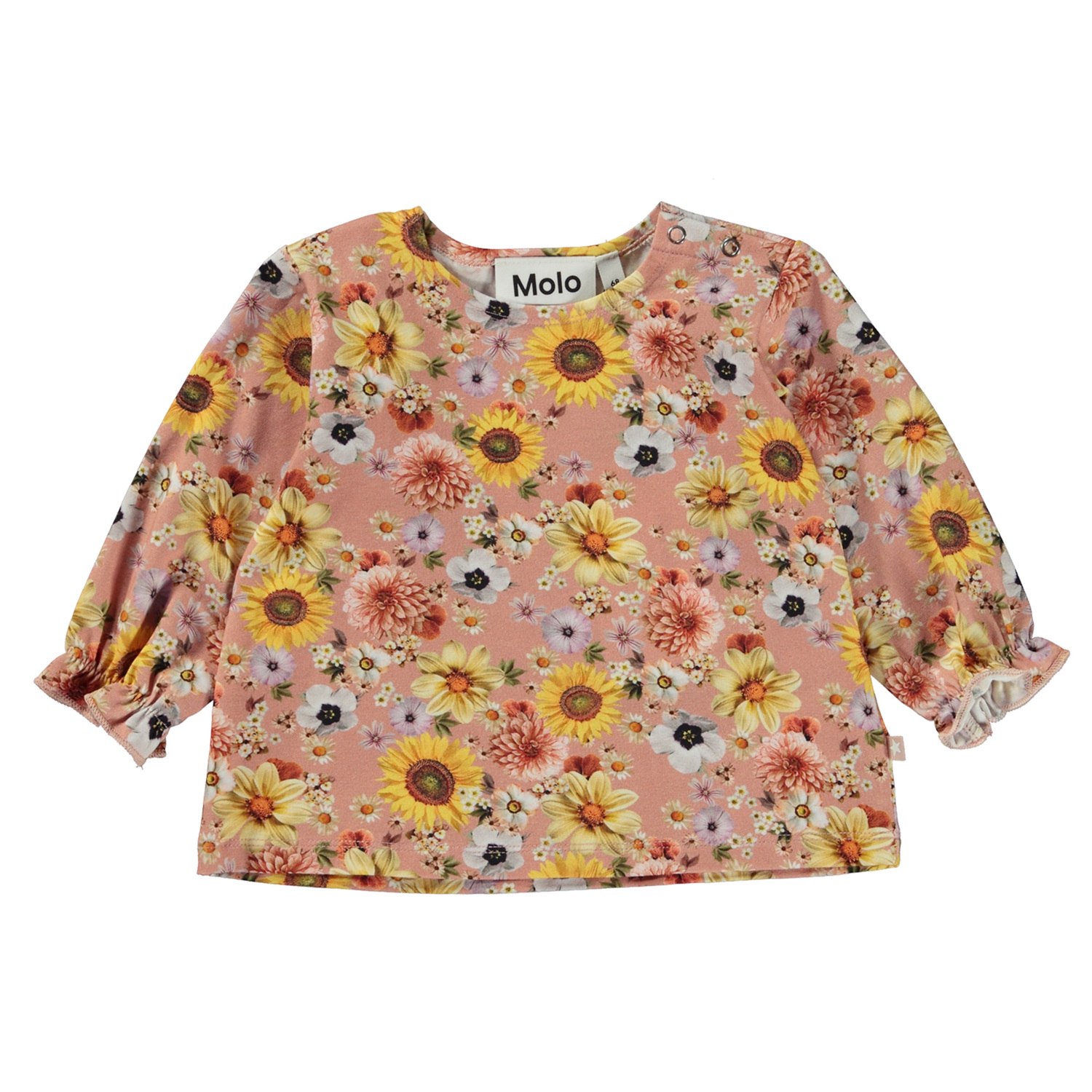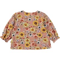 Rosafarbener Babypullover mit buntem Blumendruck. Der Pullover hat süße Ärmel mit elastischen Ärmelabschlüssen, sowie einen Knopfverschluss im Kragen.