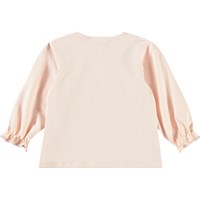 Langärmeliges Oberteil für die Kleinen aus Öko-Baumwolljersey. Das Oberteil hat eine lockere Passform und Ärmel mit elastischen Bündchen an den Handgelenken, die einen kleinen Rüschensaum bilden. Es gibt einen Knopfverschluss an der Schulter, der das An- und Ausziehen erleichtert. Das Oberteil ist rosa mit einem Frontdruck von Hasen und Löwenzahn.