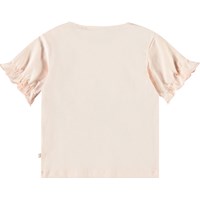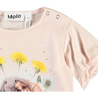 T-Shirt für die Kleinen aus Öko-Baumwoll-Jersey. Das T-Shirt hat eine lockere Passform und Ärmel mit elastischem Saum, der eine kleine Rüsche bildet. Es gibt einen Knopfverschluss an der Schulter, der das An- und Ausziehen erleichtert. Das T-Shirt ist rosa mit einem Frontdruck von Hasen und Löwenzahn.
