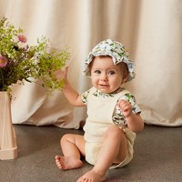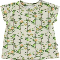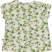 Elly ist ein cremefarbenes Baby-T-Shirt aus 100 % Öko-Baumwolljersey. Elly hat einen Knopfverschluss an einer Schulter, was das An- und Ausziehen erleichtert. Das T-Shirt ist mit feinen Apfelzweigen bedruckt.