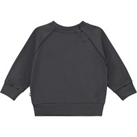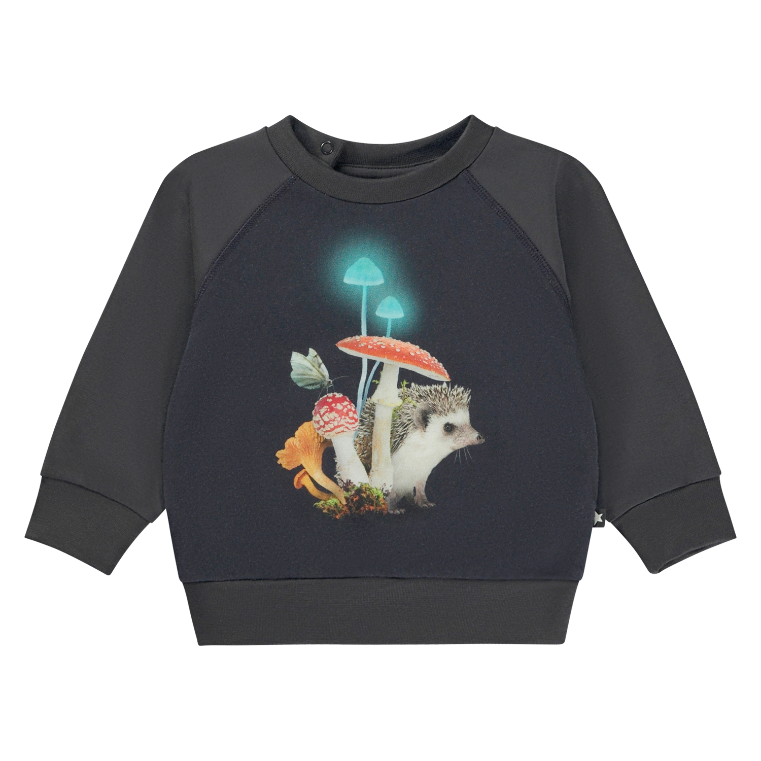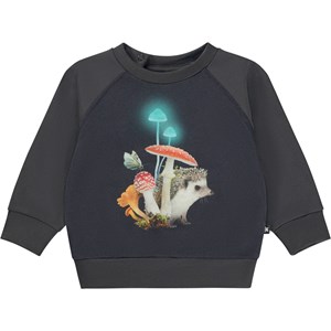 Grauer Baby-Pullover mit Aufdruck eines Igels und einigen leuchtenden Pilzen auf der Vorderseite. Der Pullover hat Raglanärmel und einen Druckknopf am Hals, der das An- und Ausziehen der Bluse erleichtert.