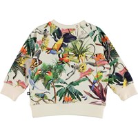 Elsa ist eine cremefarbene Babybluse mit einem Print eines Fantasy-Dschungels voller Tiere und Pflanzen. Elsa hat Raglanärmel und einen Druckknopf am Hals, der das An- und Ausziehen der Bluse erleichtert.
