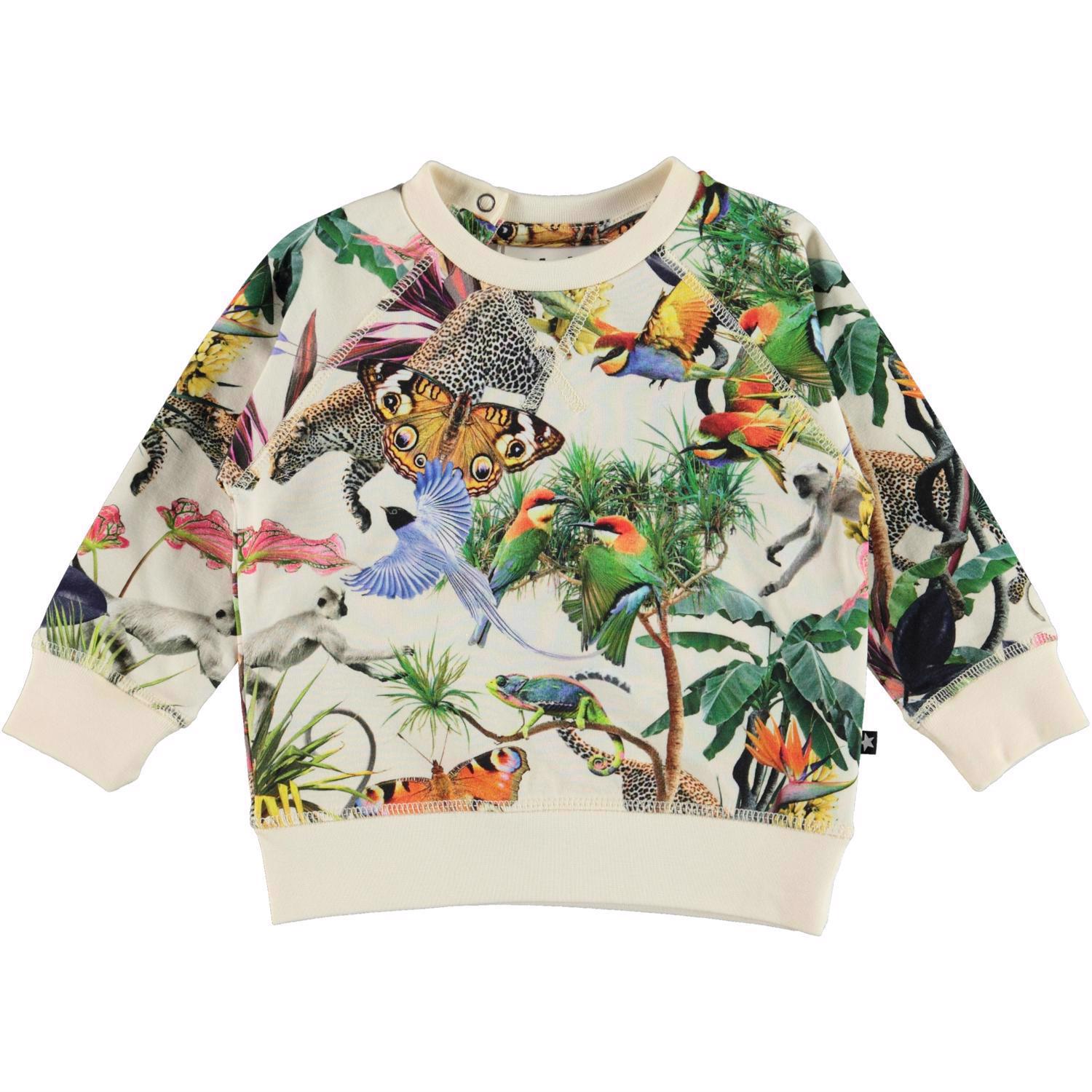 Elsa ist eine cremefarbene Babybluse mit einem Print eines Fantasy-Dschungels voller Tiere und Pflanzen. Elsa hat Raglanärmel und einen Druckknopf am Hals, der das An- und Ausziehen der Bluse erleichtert.