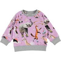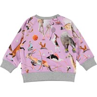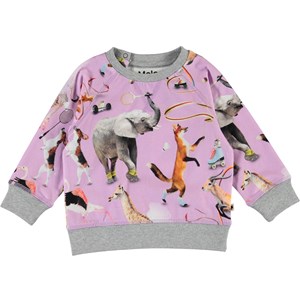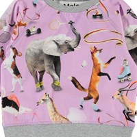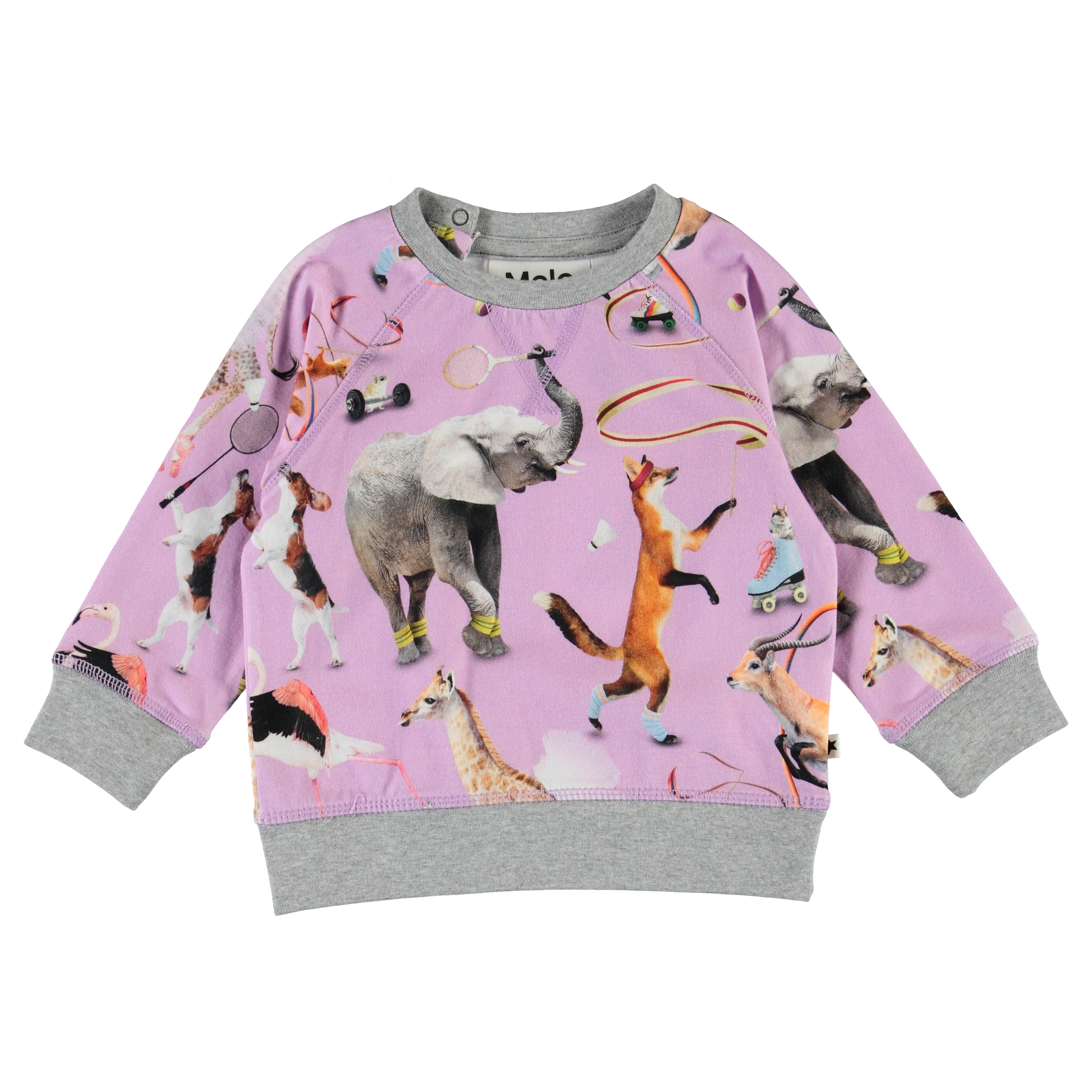 Elsa ist eine lila Babybluse mit Druck verschiedener Tiere die Sport treiben. Elsa hat Raglanärmel und einen Druckknopf im Nakken, der das An- und Ausziehen der Bluse erleichtert.