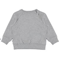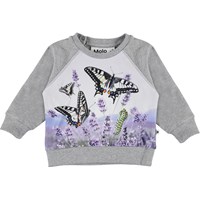 Elsa ist ein graues Baby-Sweatshirt mit einem Vorderdruck aus Schmetterlingen und Blumen. Die Bluse hat Raglanärmel und Druckknöpfe am Hals.