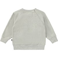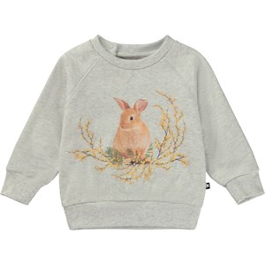 Hellgrauer Baby-Pullover mit Aufdruck eines süßen Kaninchen auf der Vorderseite. Der Pullover hat Raglanärmel und einen Druckknopf am Hals, der das An- und Ausziehen der Bluse erleichtert.