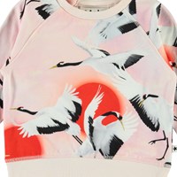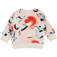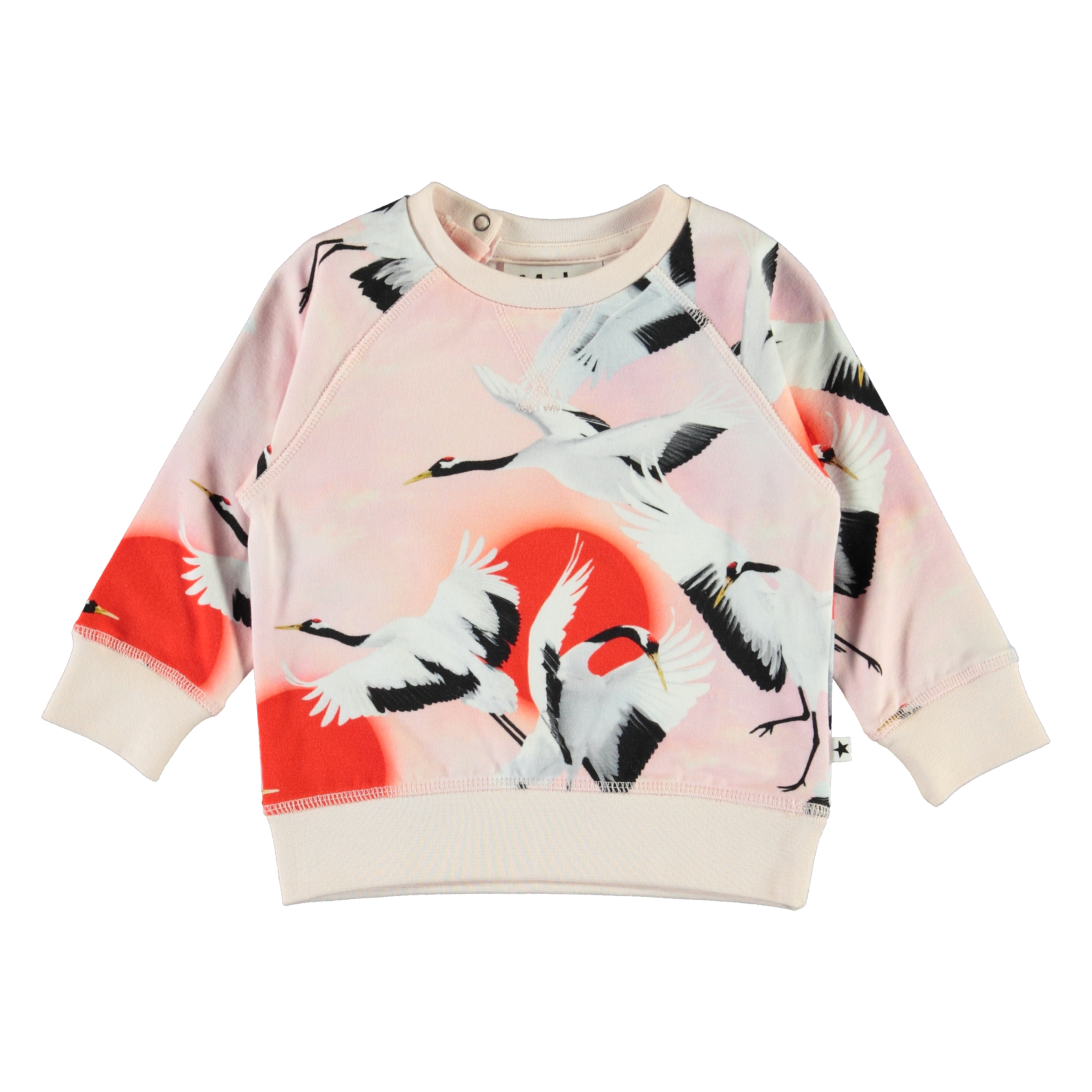 Elsa ist eine rosa Babybluse mit Druck von fliegenden Kanichen. Elsa hat Raglanärmel und einen Druckknopf im Nakken, der das An- und Ausziehen der Bluse erleichtert.