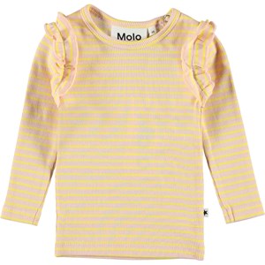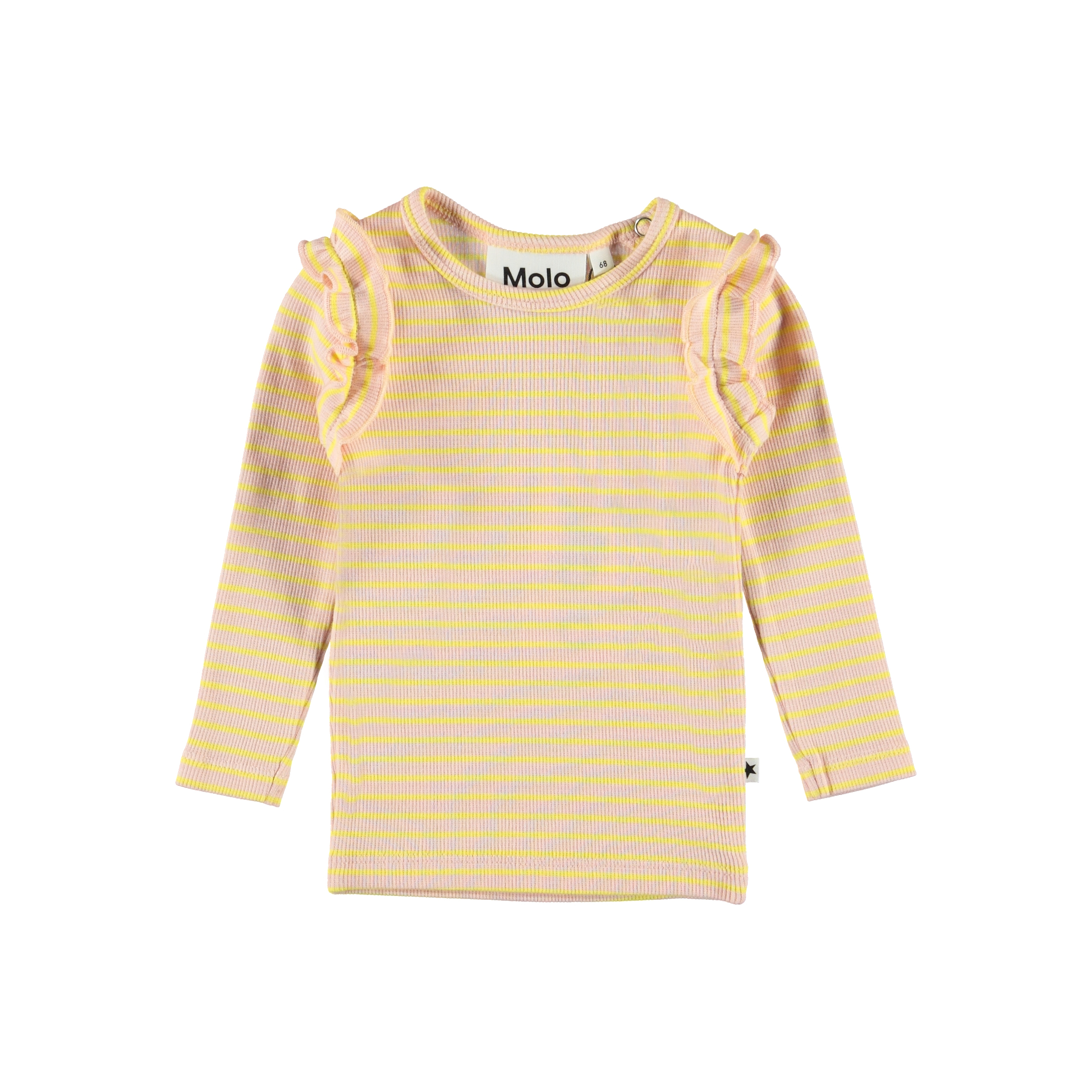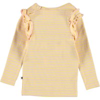 Emma ist eine Babybluse in rosa mit gelben Streifen. Die Bluse hat lange Ärmel mit Rüschen und einen Druckknopf an einer Schulter.