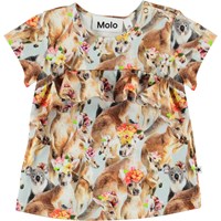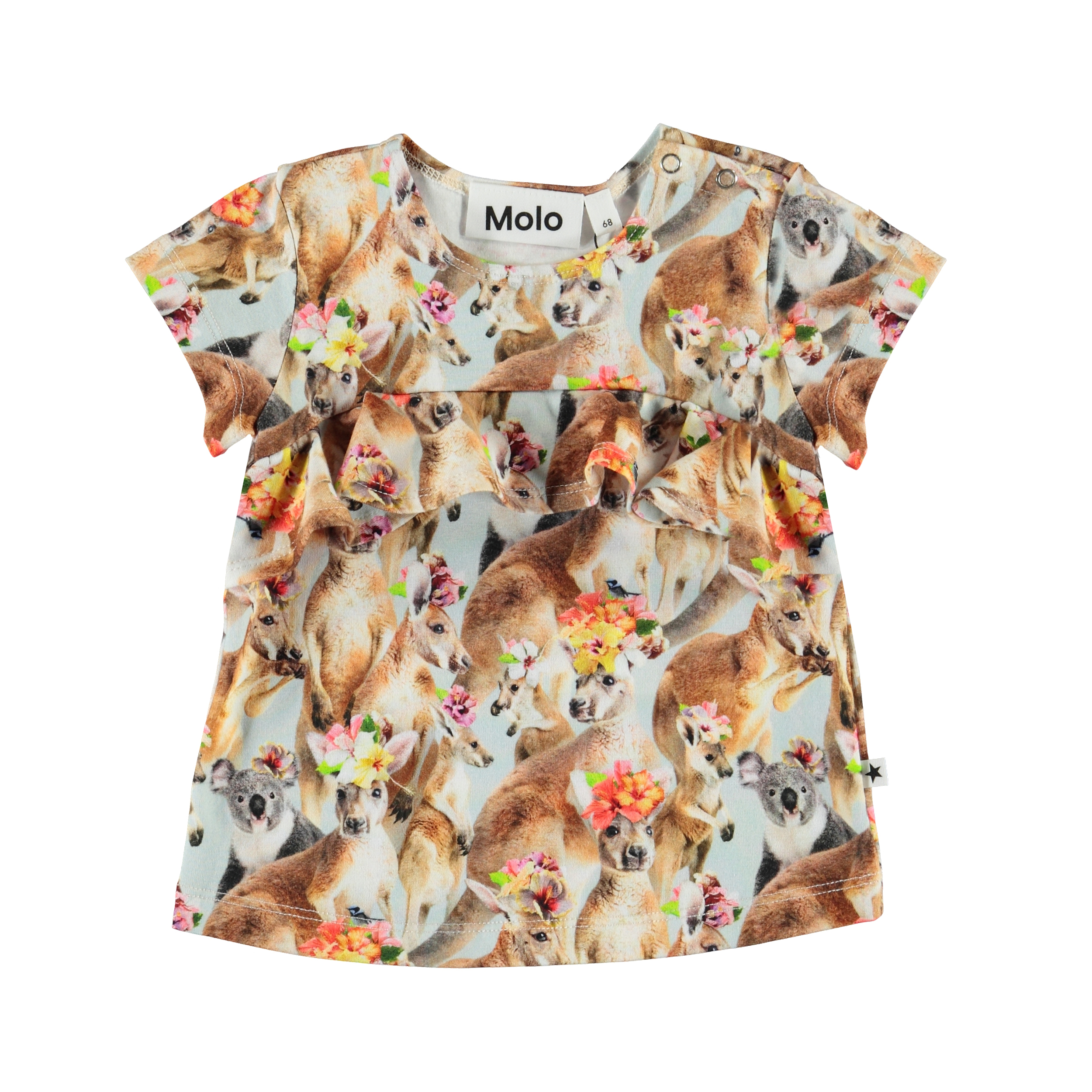 Esmeralda ist ein Baby-T-Shirt mit einem Allover-Print von Kängurus und Blumen. Das T-Shirt hat eine Rüschenkante über der Brust sowie Druckknöpfe an einer Schulter, die das An- und Ausziehen erleichtern.