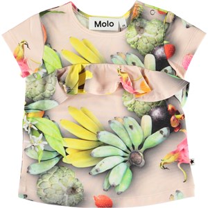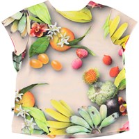 Esmeralda ist ein Baby-T-Shirt mit einem Allover-Print aus tropischen Früchten. Das T-Shirt hat eine Rüschenkante über der Brust sowie Druckknöpfe an einer Schulter, die das An- und Ausziehen erleichtern.