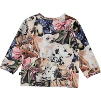 Eva ist ein Baby-Pullover mit Druck von kleinen Hunden mit einerSchleifen um den Hals. Der Pullover hat Knopfverschluss auf der einen Schulter, der das an- und ausziehen einfach macht. Ecocert Greenlife, certifikationsnr. 197496