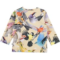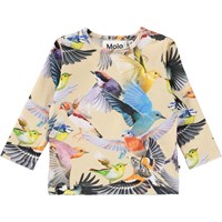 Eva ist ein hellgelbes Babyshirt mit Aufdrucken verschiedener Vögel. Das Shirt hat einen Knopfverschluss an einer Schulter, was das An- und Ausziehen der Bluse erleichtert.