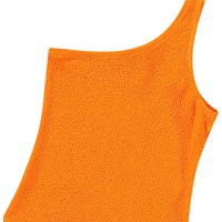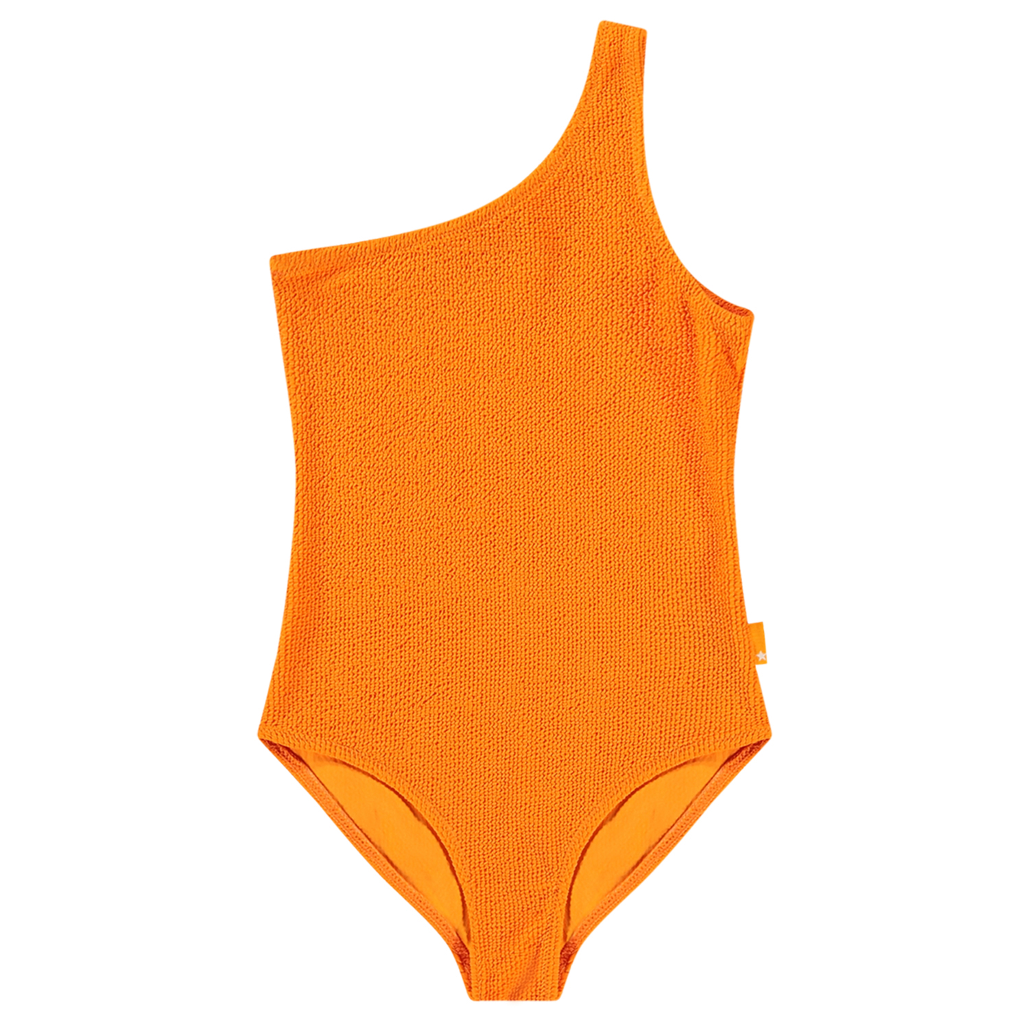 Oranger Einteiler-Badeanzug mit Textur und UV-Schutz 50+.Der Badeanzug hat eine normale Passform, einen asymmetrischen breiten Träger und ist komplett gefüttert. Das Produkt ist CE-gekennzeichnet und gemäß der Norm EN-13758-1 getestet.