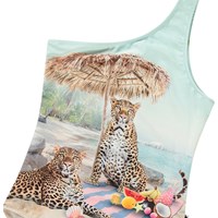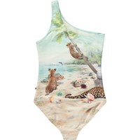 Einteiliger Badeanzug aus recyceltem Polyester mit UV-Schutz 50+. Der Badeanzug hat eine reguläre Passform, einen asymmetrischen breiten Träger und ist komplett gefüttert. Er ist hellblau mit einem Leoparden-Print am Strand. Das Produkt ist CE-gekennzeichnet und gemäß der Norm EN-13758-1 getestet.