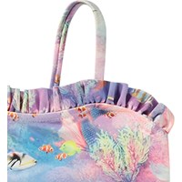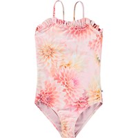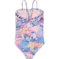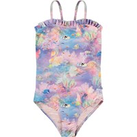 Badeanzug für aktive Kinder aus recyceltem Polyester mit UV-Schutz 50+. Der Badeanzug hat eine normale Passform, dünnen Träger, Rüschenkante oben und ist komplett gefüttert. Er verfügt über ein Allover-Print eines pinken, blauen und lila Korallenriffs. Das Produkt ist CE-gekennzeichnet und gemäß der Norm EN-13758-1 getestet.