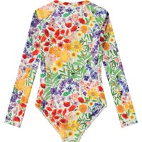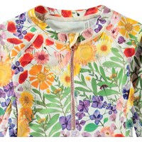 Badeanzug für aktive Kinder aus recyceltem Polyester mit UV-Schutz 50+. Der Badeanzug hat eine enge Passform, einen Stehkragen, einen Frontreißverschluss und lange Raglanärmel für zusätzlichen Schutz vor den Strahlen der Sonne. Der Badeanzug ist weiß mit einem Allover-Druck bunter gepresster Blumen. Das Produkt ist CE-gekennzeichnet und gemäß der Norm EN-13758-1 getestet.