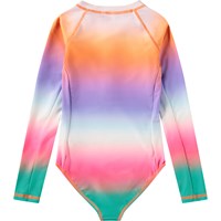 Bunt gestreifter Badeanzug für aktive Kinder aus recyceltem Polyester mit UV-Schutz 50+. Der Badeanzug hat eine enge Passform, einen Stehkragen, einen Frontreißverschluss und lange Raglanärmel für zusätzlichen Schutz vor den Strahlen der Sonne. Das Produkt ist CE-gekennzeichnet und gemäß der Norm EN-13758-1 getestet.