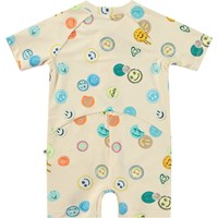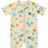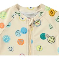 Badeanzug mit kurzen Ärmeln und Beinen für die Kleinen, aus recyceltem Polyester und mit UV-Schutz 50+. Der Badeanzug hat einen Reißverschluss vorne, was das An- und Ausziehen erleichtert. Er hat einen Stehkragen und viel Platz für eine Windel. Der Badeanzug ist beige mit einem Allover-Druck bunter, lächelnder Gesichter. Das Produkt ist CE-gekennzeichnet und gemäß der Norm EN-13758-1 getestet.