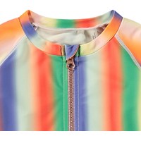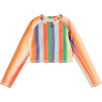 Regenbogenfarbener Langarm-Rashguard aus recyceltem Polyester mit UPF 50+ Schutz. Das Oberteil hat ein eng anliegendes Design, einen Stehkragen und einen Frontreißverschluss, der das An- und Ausziehen erleichtert. Das Produkt ist CE-gekennzeichnet und gemäß der Norm EN-13758-1 getestet.