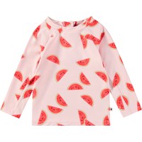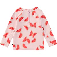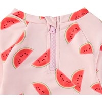 Rashguard für die Kleinen aus recyceltem Polyester mit UV-Schutz 50+. Das Shirt hat eine enge Passform, einen Stehkragen, einen Reißverschluss hinten für einfaches An- und Ausziehen und lange Raglanärmel zum Schutz vor den Strahlen der Sonne. Der Rashguard ist pink mit einem Allover-Druck von reifen Wassermelonen-Scheiben. Das Produkt ist CE-gekennzeichnet und gemäß der Norm EN-13758-1 getestet.