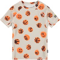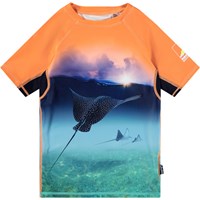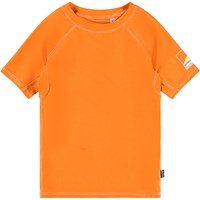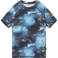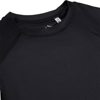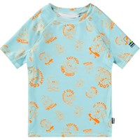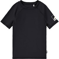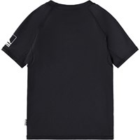 Schwarzes Schwimmshirt für aktive Kinder, aus recyceltem Polyester mit UV50+ Schutz. Es hat eine enge Passform mit Stehkragen und kurzen Raglanärmeln. Das dehnbare Material sorgt für hohen Komfort und ist perfekt für Strand und Pool.