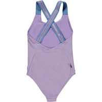 Badeanzug in Lila mit Wellenstruktur und dünnen, in den Stoff eingewebten Goldfäden. Der Badeanzug hat einen runden Ausschnitt und breite, gestreifte elastische Träger in Blau, Lila und Gold, die sich am weichen V-Ausschnitt am Rücken kreuzen. Durch das elastische Material ist das An- und Ausziehen äußerst bequem und einfach. Er bietet einen hohen UV-Schutz von 50+ und schützt so effektiv vor Sonnenstrahlen. Das Produkt ist CE-gekennzeichnet und gemäß der Norm EN-13758-1 getestet.