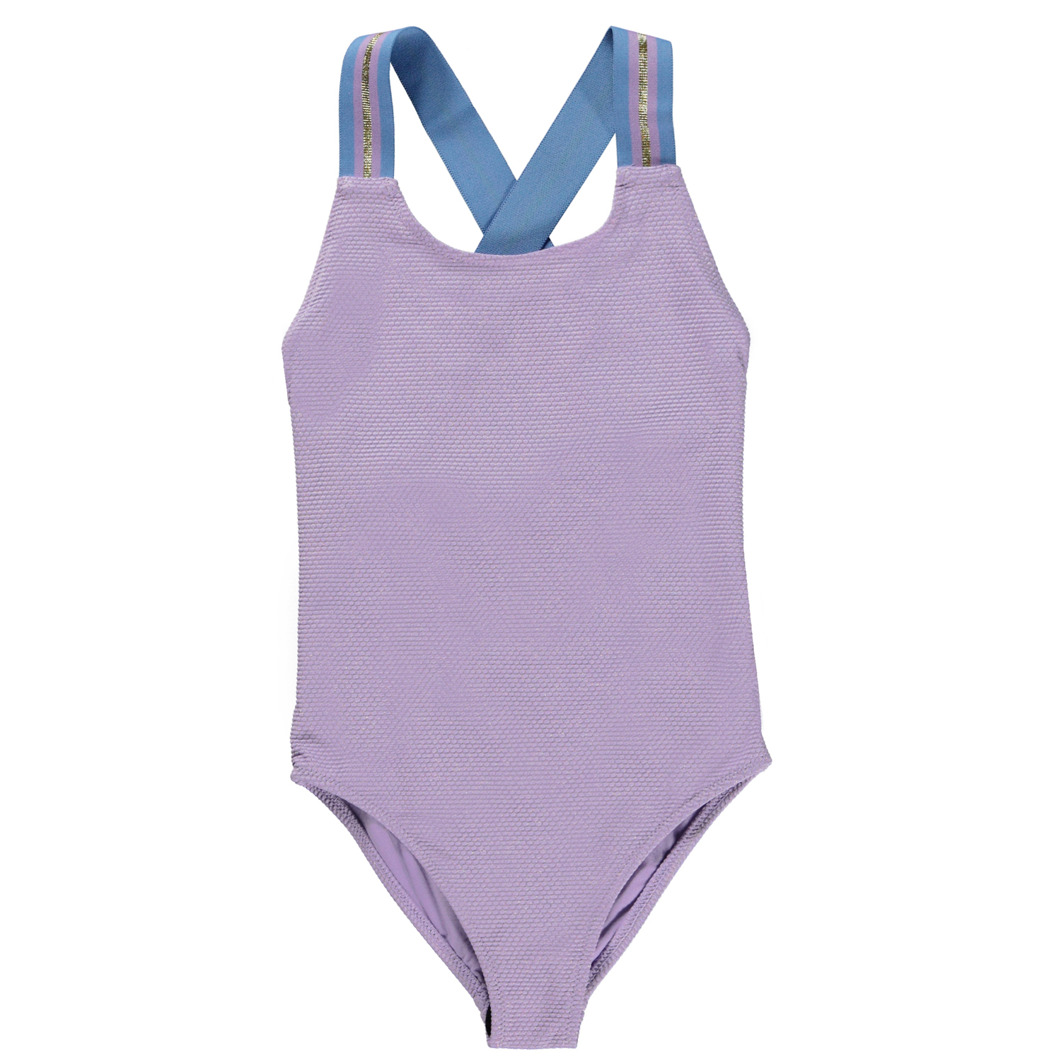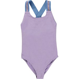 Badeanzug in Lila mit Wellenstruktur und dünnen, in den Stoff eingewebten Goldfäden. Der Badeanzug hat einen runden Ausschnitt und breite, gestreifte elastische Träger in Blau, Lila und Gold, die sich am weichen V-Ausschnitt am Rücken kreuzen. Durch das elastische Material ist das An- und Ausziehen äußerst bequem und einfach. Er bietet einen hohen UV-Schutz von 50+ und schützt so effektiv vor Sonnenstrahlen. Das Produkt ist CE-gekennzeichnet und gemäß der Norm EN-13758-1 getestet.