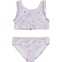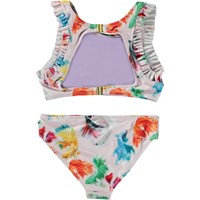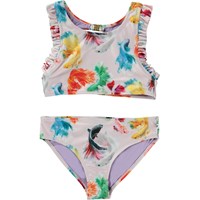 Rosafarbener Bikini mit einem Aufdruck aus bunten Schleierschwanzfischen. Der Bikini hat ein weites Oberteil mit Rüschen am Armloch. Die Rückseite ist offen und wird mit zwei feinen Goldhaken geschlossen. Der Bikini besteht aus recyceltem Polyester und verfügt über einen hohen UV-Schutz 50+. Das Produkt ist CE-gekennzeichnet und gemäß der Norm EN-13758-1 getestet.