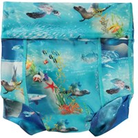 Blaue, auslaufsichere Windel-Badehose mit Aufdrucken verschiedener Meerestiere. Die Badehose ist gefüttert und hat eine elastische, körpernahe Passform, die dafür sorgt, dass sie auch bei einem Unfall eng sitzt. Das bedeutet, dass sie ohne normale Einweg-Badewindel verwendet werden können. Sie bestehen aus recyceltem Polyester und bieten einen hohen UV-Schutz von 50+ und schützen so effektiv vor Sonnenstrahlen. Das Produkt ist CE-gekennzeichnet und gemäß der Norm EN-13758-1 getestet.