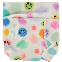 Helle, auslaufsichere Windel-Badehose mit niedlichem Aufdruck aus pastellfarbenen Punkten, teilweise mit Emoji-Gesichtern. Die Badehose ist gefüttert und hat eine elastische, körpernahe Passform, die dafür sorgt, dass sie auch bei einem Unfall eng sitzt. Das bedeutet, dass sie ohne normale Einweg-Badewindel verwendet werden können. Sie bestehen aus recyceltem Polyester und bieten einen hohen UV-Schutz von 50+ und schützen so effektiv vor Sonnenstrahlen. Das Produkt ist CE-gekennzeichnet und gemäß der Norm EN-13758-1 getestet.