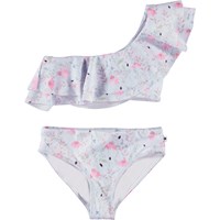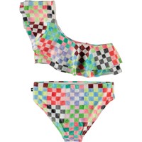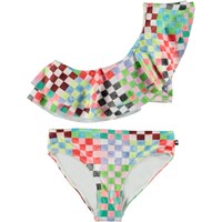 Asymmetrischer Bikini mit Karodruck in verschiedenen Farben. In einigen Würfeln sind kleine Friedenszeichen sowie Yin- und Yang-Symbole versteckt. Das Bikinioberteil hat rundum einen breiten Rüschenrand mit zwei Lagen, der einen schönen Welleneffekt ergibt. Der Bikini besteht aus recyceltem Polyester und verfügt über einen hohen UV-Schutz 50+. Das Produkt ist CE-gekennzeichnet und gemäß der Norm EN-13758-1 getestet.