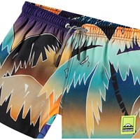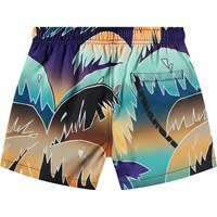 Sportliche Badeshorts für aktive Kinder aus recyceltem Polyester mit UV-Schutz 50+. Die Badeshorts haben eine lockere Passform, reichen bis zur Mitte des Oberschenkels, haben eine einfache Gesäßtasche, einen elastischen Bund mit Kordelzug und weiche Mesh-Innenhosen. Die Badeshorts haben einen Druck von Palmen in Blau, Orange, Schwarz und Lila. Das Produkt ist CE-gekennzeichnet und gemäß der Norm EN-13758-1 getestet.
