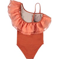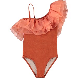 Nilla ist Molos neuer asymmetrischer und skulptureller Badeanzug mit einem großen und schönen doppellagigen Siphonkragen, der die Passform behält, kein Wasser aufnimmt, wenn er nass wird und genauso schnell trocknet wie der Rest des Badeanzugs. Hier mit pfirsichfarbenem Kragen und rostrotem Anzug mit eingewebten dünnen gelben Fäden. Die Bademode von Molo hat einen UV Schutz von 50+. Das Produkt ist CE-gekennzeichnet und gemäß der Norm EN-13758-1 getestet.
